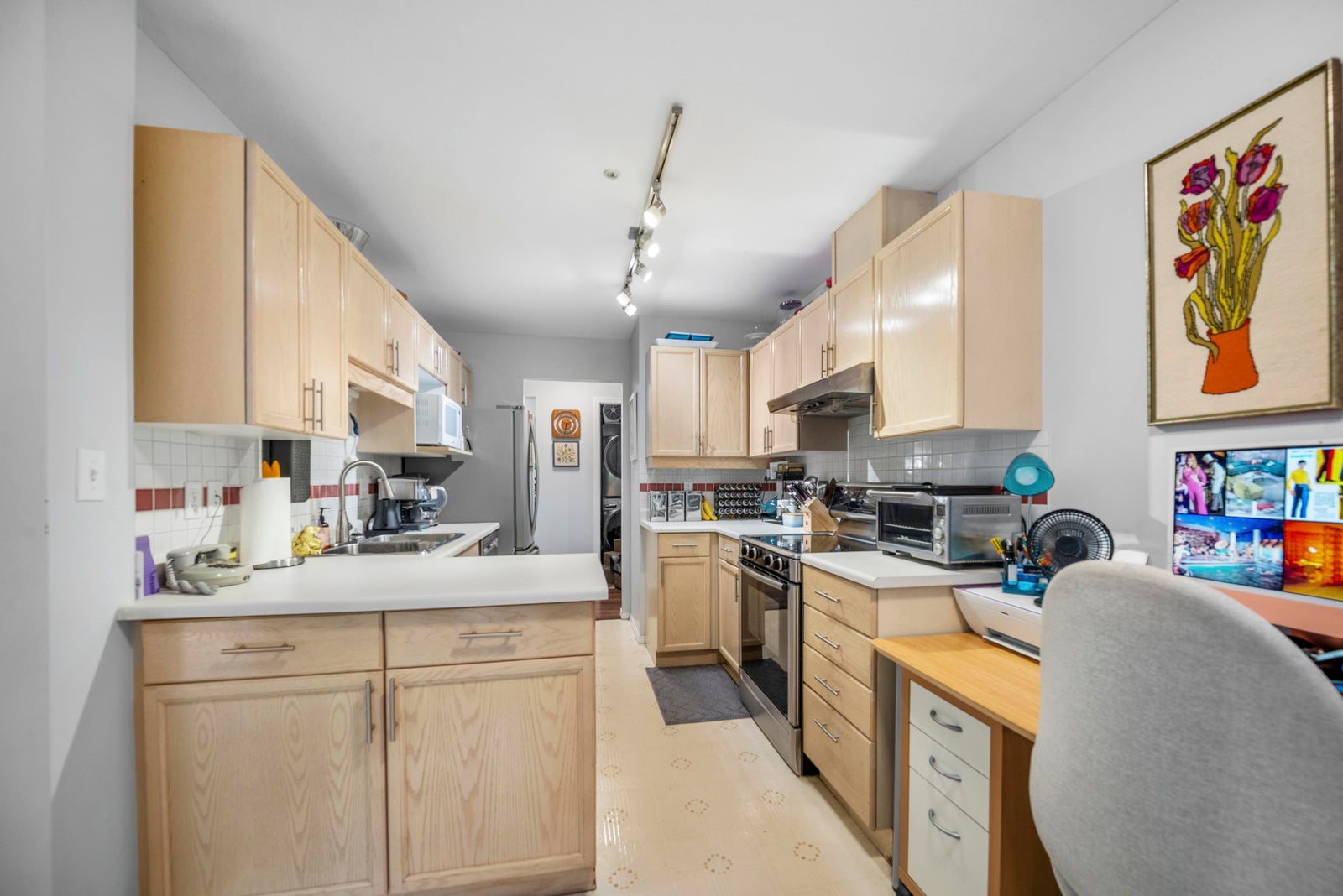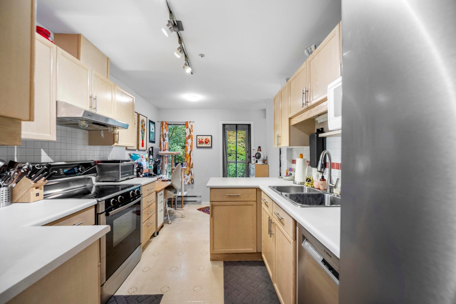 Welcome to Tiffany Ridge! This TOP FLOOR unit is nearly 1200 Sq Ft and boasts a huge Primary Bedroom with walk-in-closet, an En-suite Bathroom and private balcony. Massive living space, great for entertaining equipped with a dining area fit to seat up to 8 people. Kitchen is equipped with new SS Appliances & eat-in kitchen, and the 2nd balcony brings the common space together perfectly. An incredibly well-run Strata, this PET FRIENDLY building comes with 2 Parking stalls, Storage and In Suite Laundry (new LG Washer & Dryer). Private unit with only 1 shared wall. Located within walking distance to The River District, trails, parks and public transportation.